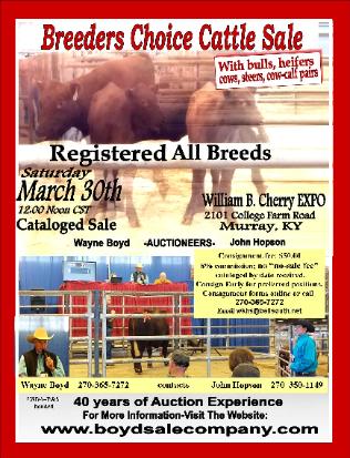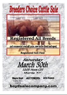 | Breeders Choice Cattle Sale MARCH 30th - Murray, KY 30 + already consigned Still taking entries for Registered All Breed AND for commercial cow-calf pairs, heifers/cows (bred and open) Registered cattle sell first Barns open for Receiving at 11:30 am Friday March 29th Quality Inn - host motel $85.00 + tax for Cattle Sale. Quality Inn - Murray, KY -- 270-759-5910 |